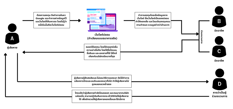 จากการสืบสวนทำให้ทราบว่า นายเอผู้เสียหายถูกนายบีและนางซีหลอกลวง ชักชวนให้ลงทุนปลอมโดยอ้างชื่อธนาคารชื่อดังที่มีอยู่จริง ซึ่งกลยุทธ์ที่คนกลุ่มนี้ใช้คือการตั้งชื่อเว็บไซต์(ชื่อโดเมน)ปลอมให้ใกล้เคียงกับเว็บไซต์จริงมากที่สุด อีกทั้งยังออกแบบหน้าเว็บไซต์ได้คล้ายคลึงกับเว็บไซต์จริงมากจนแยกได้ยาก และยังใช้ชื่ออีเมลใกล้เคียงกับของพนักงานในธนาคารจริงอีกด้วย หรือแม้กระทั่งเอกสารรวมถึงจดหมายในการลงทุนต่าง ๆ ที่เกี่ยวข้องก็ออกแบบมาให้มีลักษณะคล้ายของธนาคาร ทำให้นายเอไม่ทันสังเกตุ หลงเชื่อ ทำการโอนเงินให้หลายครั้งรวมมูลค่าความเสียหายกว่าล้านบาท